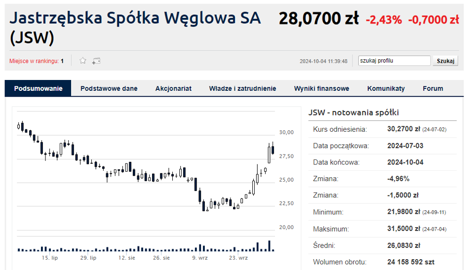 Kurs JSW w czwartek na sesji zyskał blisko 8,4 proc. przy ponad 43 mln zł obrotu, na początku sesji kurs rósł nawet o 10 proc. W piątek, po początkowych wzrostach na otwarciu sesji, kurs JSW zaczął osuwać się w dół i już po godzinie 10.20 zniżkował o przeszło 2 proc.