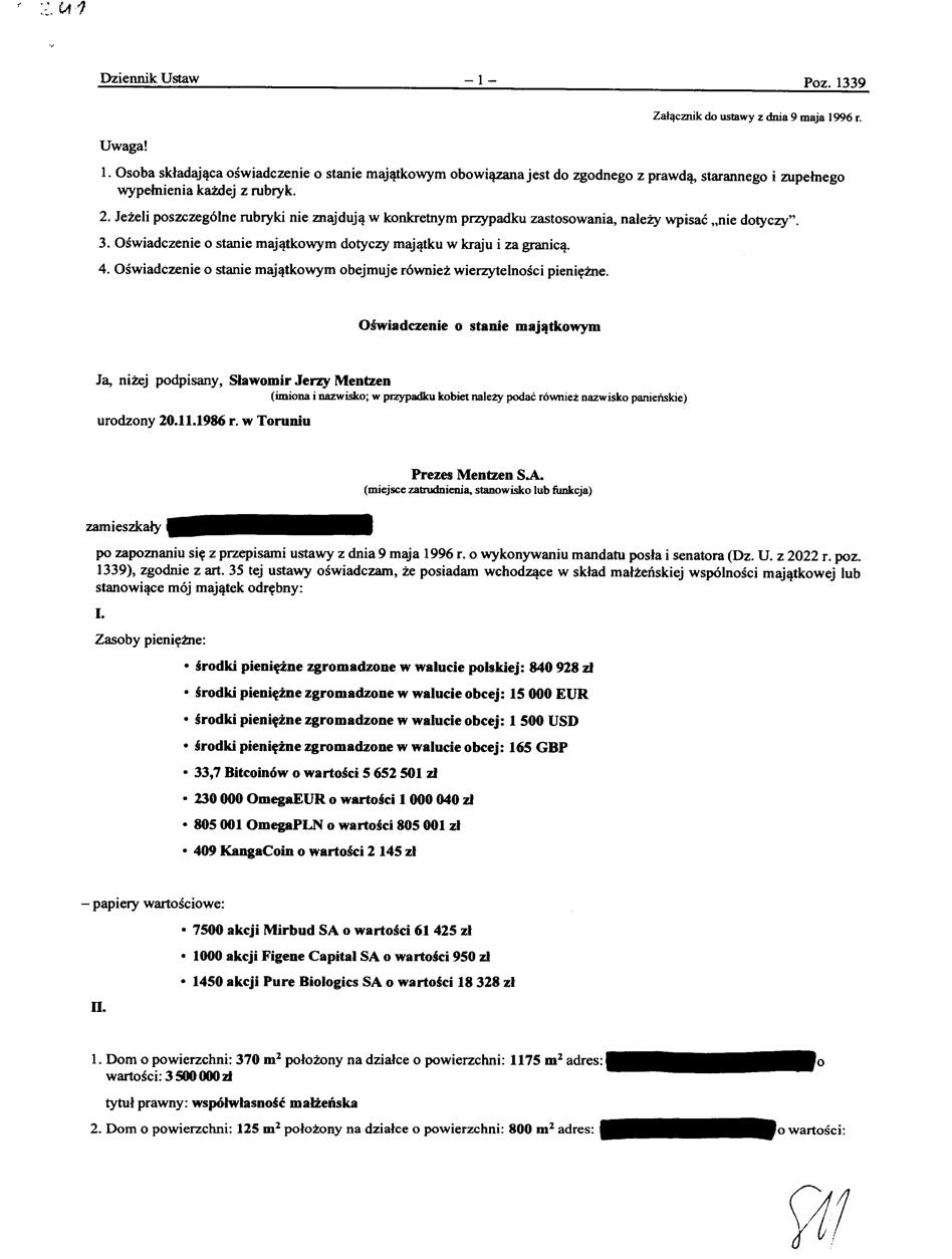 Mentzen ma też sporo kryptowalut. Zadeklarował 33,7 bitcoina o wartości 5 652 501 zł, 230 000 OmegaEUR o wartości 1 000 040 zł, 805 001 OmegaPLN o wartości 805 001 zł i 409 KangaCoin o wartości 2 145 zł.