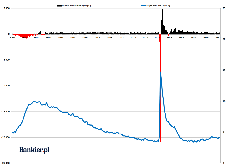 Stopa bezrobocia w marcu 2025 roku w Stanach Zjednoczonych wzrosła do 4,2% po tym, jak w lutym podniosła się z 4,0% do 4,1%. To także spore zaskoczenie, ponieważ ekonomiści przewidywali jej stabilizację. W liczbach bezwzględnych przekładało się to na wzrost liczby bezrobotnych o 31 tysięcy przy wzroście liczby pracujących o 201 tys. oraz spadku populacji biernych zawodowo o 56 tysięcy. Są to wyniki niezależnego badania ankietowego (BAEL), przy pomocy której BLS szacuje skalę bezrobocia.