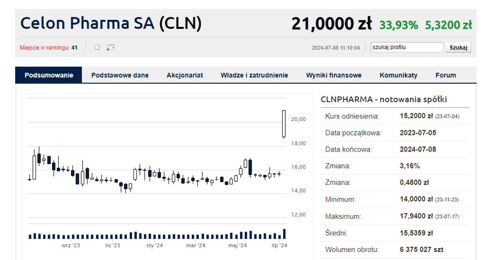 Celon Pharma przekazała informacje o wynikach badań II fazy klinicznej CPL'36 w leczeniu ostrej schizofrenii w piątek 5 lipca po zakończeniu sesji giełdowej. Wyniki tak bardzo spodobały się inwestorom, że w poniedziałek 8 lipca po otwarciu sesji giełdowej podnieśli cenę akcji spółki o 31,3 proc. do ceny 20,60 zł na akcję.