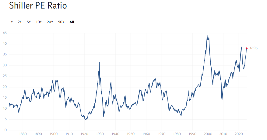 Temat bardzo wysokich wycen na amerykańskim rynku finansowym nie jest nową kwestią i przez ostatnie kilka lat był on regularnie poruszany przez analityków. Spółki z indeksu S&P500 są obecnie wyceniane na przeszło 30-krotność zysków za ostatnie cztery kwartały – wynika z danych mulpl.com. Przez poprzednie 150 lat wyższe wskaźniki c/z dla amerykańskiego rynku akcji obserwowano jedynie w szczycie bańki internetowej pod koniec XX wieku oraz tuż po jej pęknięciu w roku 2000, jak również podczas covidowej hossy z lat 2020-21.