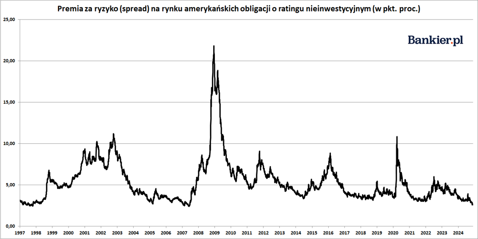 Z kolei wycena „obligacji śmieciowych” w listopadzie wyrównała historycznie rekordowo optymistyczne poziomy z lat 1997 i 2007. To pokazuje, jak euforyczne nastroje panują na amerykańskim rynku finansowym i że inwestorzy zza oceanu spozycjonowani są tylko pod najbardziej pozytywne scenariusze ekonomiczno-finansowe.