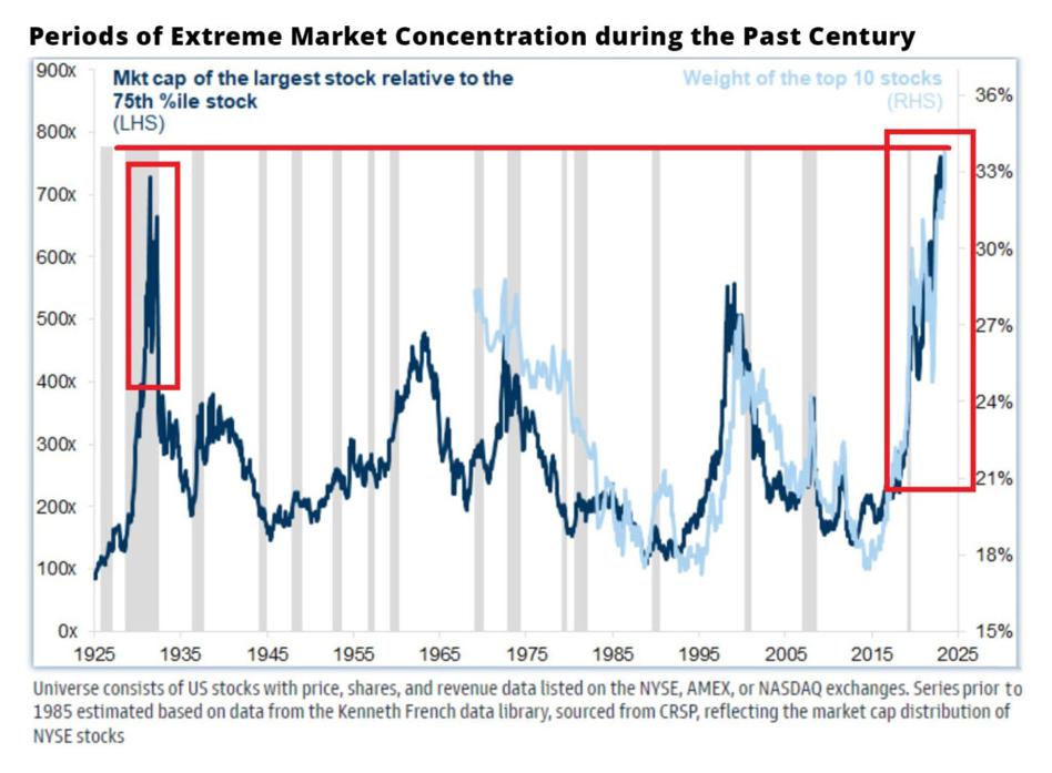 Warto przy tym odnotować, że trwająca od ponad dwóch lat hossa na Wall Street bazuje na bardzo wąskiej grupie spółek technologicznych – tzw. Siedmiu Wspaniałych. Zaledwie 10 spółek w 2024 roku odpowiadało za niemal 35% wartości rynkowej całego indeksu S&P500. Nawet podczas bańki internetowej czy dekady lat 70-tycj (spółki Nifty-Fifty) koncentracja amerykańskiego rynku akcji nie była tak silna, jak obecnie. Niewiele mniejsza była jedynie pod koniec lat 20-tych XX wieku.