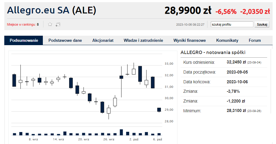 W czwartek po sesji agencja Bloomberga poinformowała, że fundusze Cidinan i Mepinan, czyli dwóch dużych akcjonariuszy Allegro, są gotowe sprzedać 42 mln akcji giganta e-commerce w procesie przyspieszonej budowy księgi popytu. Cenę ustalono na 29 zł, czyli od 6,6 proc. niżej od zamknięcia w czwartek.