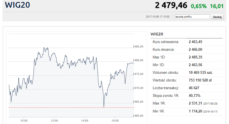 | WIG 20 | Polska | 2479,46 | 0,65 | 1,06 | -1,31 | 40,73 | 27,29 |