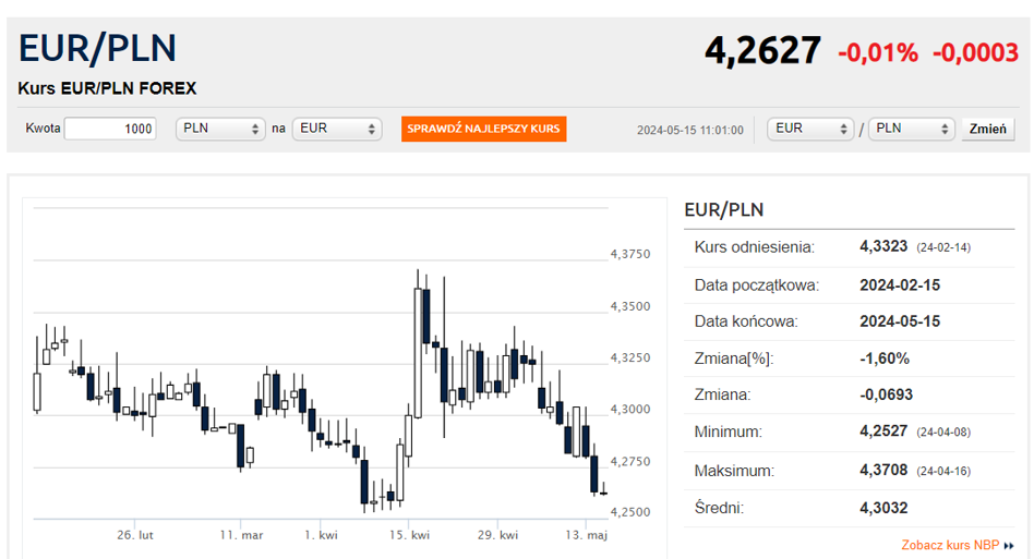 Kurs EUR/PLN wynosił w środę o godz. 8.00 do 4,2611 zł, a we wtorek po 22.15 był na 4,2604 zł, co oznacza, że był najniżej od 11 kwietnia, kiedy notował poziomy 4,25 zł niewidziane od przeszło 4 lat. Poranek obfitował w nieco więcej zmienności ze względu na bogaty kalendarz makro.