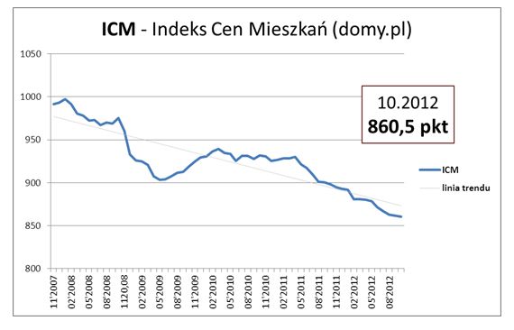 Wartość Indeksu Cen Mieszkań uwzględniającego inflację (ICMi) wyniosła w październiku 671,9 pkt. i była niższa niż we wrześniu 2007 r. o 32,8%.
