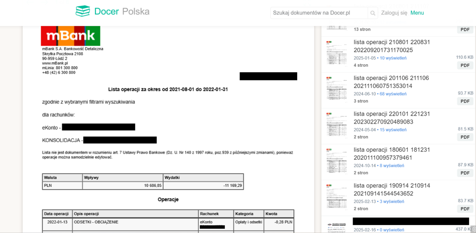 Poniżej przedstawiamy zanonimizowany fragment dokumentu, który jest obecnie powszechnie dostępny w serwisie Docer.pl - ze wszystkimi informacjami tj. numerami kont oraz imieniem i nazwiskiem właściciela rachunku osobistego.