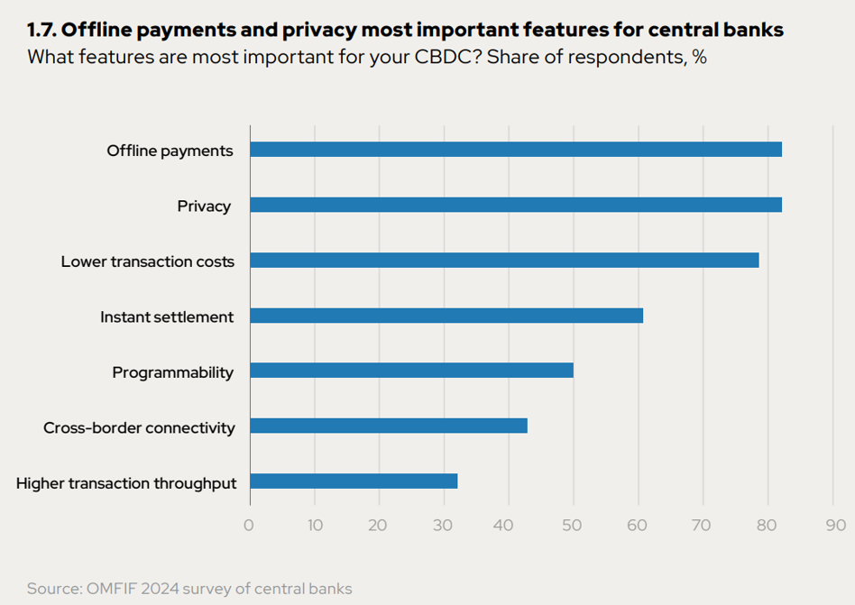 Banki centralne zapytano również o najważniejsze cechy ich projektów cyfrowego pieniądza. Na czele znalazły się możliwość dokonywania transakcji offline oraz prywatność (ponad 80 proc. wskazań). Warto zwrócić uwagę, że są to jednocześnie unikalne cechy obecnej fizycznej postaci pieniądza banku centralnego – gotówki.