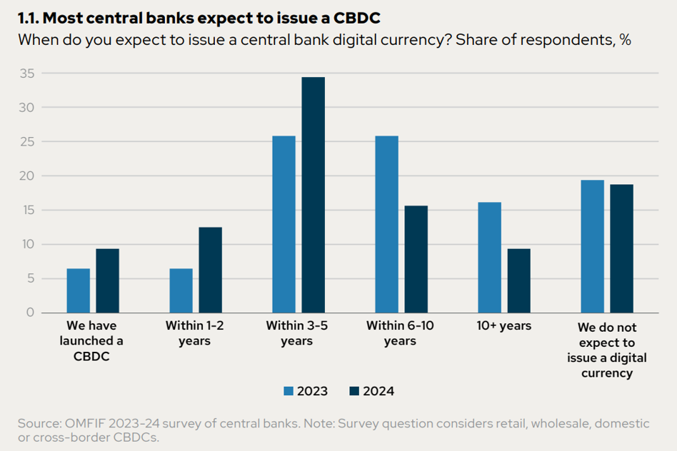 W ciągu roku lub dwóch lat wypuścić CBDC na rynek chce 12 proc. respondentów (dwukrotnie więcej niż w edycji badania z 2023 r.). W perspektywie 3-5 lat – aż 34 proc. (kontra 26 proc. w 2023 r.).