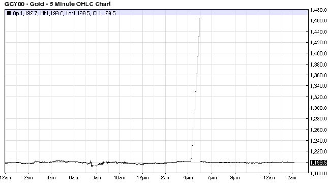 Ten wyjątkowy epizod miał miejsce podczas fazy składania zleceń przed wznowieniem handlu elektronicznego w Nowym Jorku. W regularnych, sekundowych (!) odstępach pomiędzy godziną 17:20 a 18:00 (czyli 12:00 czasu nowojorskiego) cena złota na rynku kasowym wzrastała o 10 centów (przy bardzo niskim i równie regularnym wolumenie 50 kontraktów na minutę), rosnąc z 1.201,66 do 1.467 USD/oz. Po czym, na otwarciu kurs złota jakby nigdy nic momentalnie powrócił do stanu wyjściowego (ok. 1.201 USD/oz.), a dalszy handel odbywał się już normalnie.