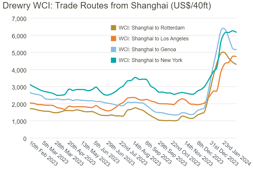 Obecnie ruch przez Morze Czerwone nie został całkowicie sparaliżowany. Akwen patrolują okręty międzynarodowej koalicji pod egidą USA. Wielu armatorów zdecydowało się jednak ograniczyć ryzyko i wybiera dłuższą drogę z Azji do Europy, nadkładając tysiące kilometrów i opływając Przylądek Dobrej Nadziei. Skok kosztów transportu morskiego w wyniku ataków jemeńskich rebeliantów obrazuje Drewry World Container Index.
