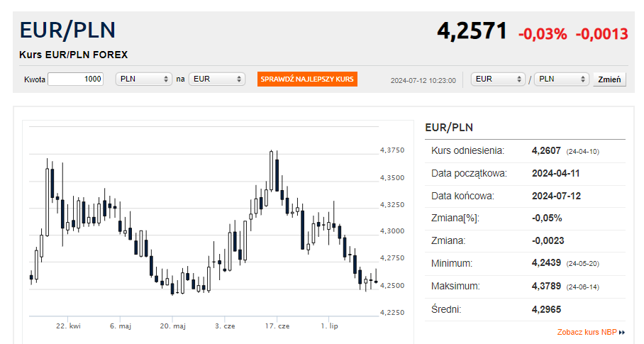 Kurs EUR/PLN spadł w czwartek po południu do 4,2476 zł i był najniżej od końca maja. Silny opór na poziomie 4,25 zł, nad którym w ostatnich dniach konsoliduje się kurs pary EUR/PLN i tym razem okazał się tylko naruszony, po czym nastąpiło odbicie do 4,2686 zł. W piątek rano notowania pary EUR/PLN stabilizowały się i godz. 10.23 kurs wynosił 4,2571 zł.