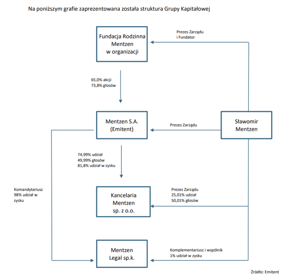 Mentzen SA to spółka holdingowa, od której zależne są firmy Kancelaria Mentzen sp. z o.o. oraz Mentzen Legal sp. k., świadczące m.in. usługi księgowości czy doradztwa prawno-podatkowego. 2 lipca 2024 r. wchodzi na giełdę z wyceną wynoszącą 36 mln zł. W przeprowadzonej z sukcesem ofercie publicznej akcje sprzedawano po 36 zł za sztukę.