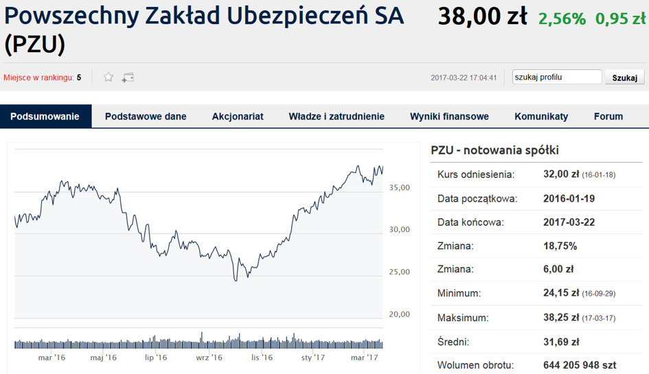 Dzisiejszą sesję PZU zamknęło spadkiem o ponad 4 proc. (co odpowiada spadkowi o 1,69 zł za akcję), najmocniejszym wśród spółek z WIG20.