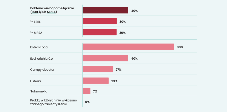 Potwierdzono obecność szczepów takich bakterii jak ESBL i MRSA, które przyczyniają się do antybiotykooporności, przez którą choroby stają się bardzo trudne lub nawet niemożliwe do wyleczenia. W badaniu wykryto także inne bakterie: w 80% próbek Enterococci, w 40% bakterie E. coli, w 27% Campylobacter, w 23% szczepy Listeria monocytogenes i w 7% bakterie z gatunku Salmonella.