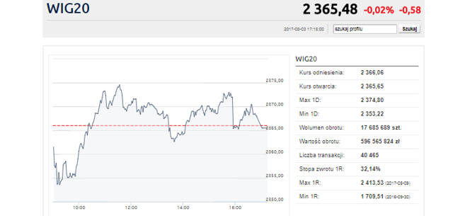 | WIG 20 | Polska | 2365,48 | -0,02 | 0,62 | 1,80 | 32,14 | 21,44 |