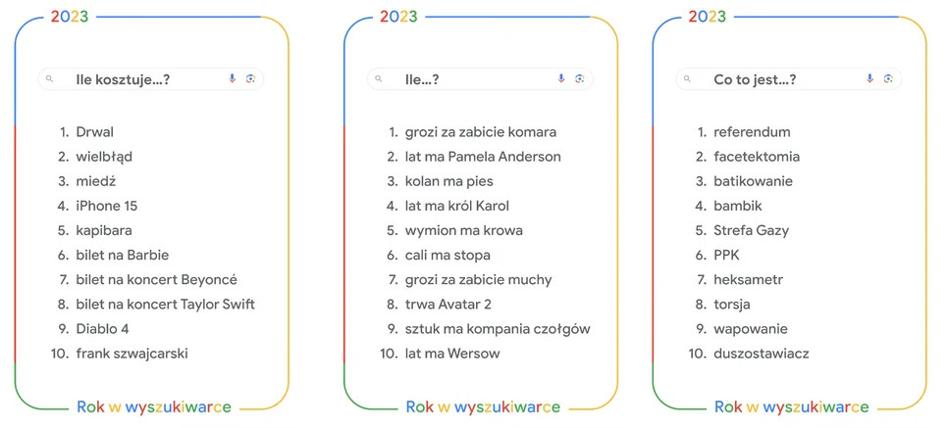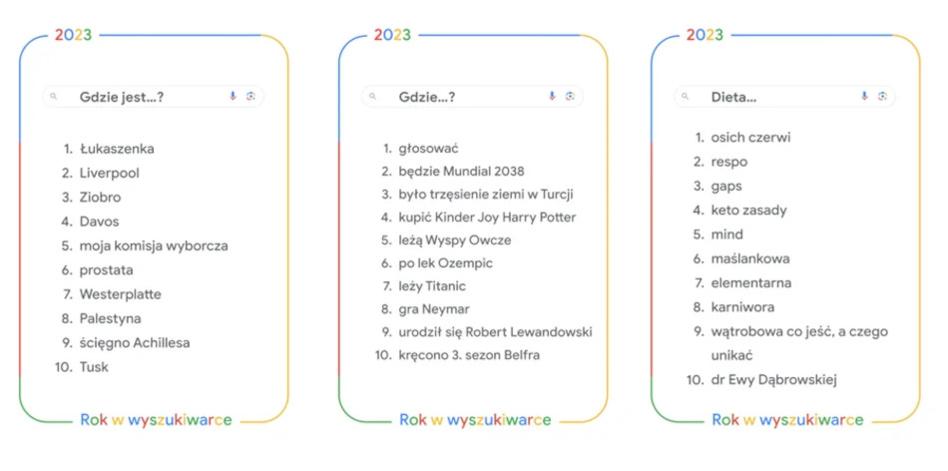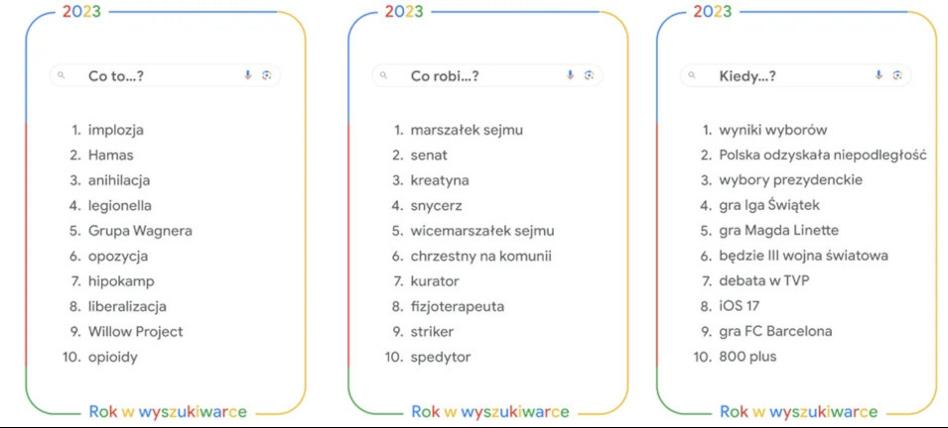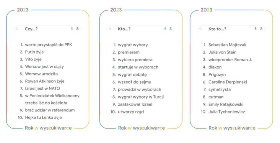Rok 2023 to oczywiście rok wyborczy, więc nic dziwnego, że te wyszukiwania zdominowały polskiego Google'a. Wśród haseł trendujących znalazły się między innymi: wyniki wyborów, debata TVP, marsz 4 czerwca, marsz Miliona Serc. Polacy sprawdzali sondaże wyborcze, kto startuje w wyborach i kto wygrał debatę, ale też zadawali wiele pytań dotyczących procesów wyborczych, m.in.: jak głosować, jak wygląda karta do głosowania, jak zmienić miejsce głosowania, a nawet, dlaczego nie brać udziału w referendum. Wśród powyborczych wyszukiwań królowały zapytania o wyniki i o to, co dalej: kto wygrał wybory, kto zostanie premierem, kto go wybiera i kto utworzy rząd.