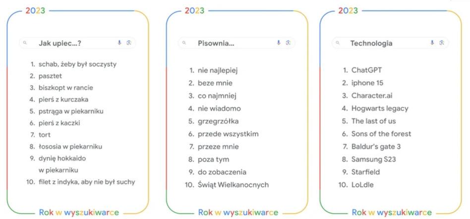 Polacy wpisywali także pytania: ile, co to jest, co robi, kiedy, dlaczego. Wiele z nich wiązało się z wydarzeniami, które kształtowały 2023 rok tj. tragiczna wyprawa łodzią Titan do wraku Titanica, pucz Prigożina i jego śmierć w katastrofie czy... jak zrobić chlebek bananowy.