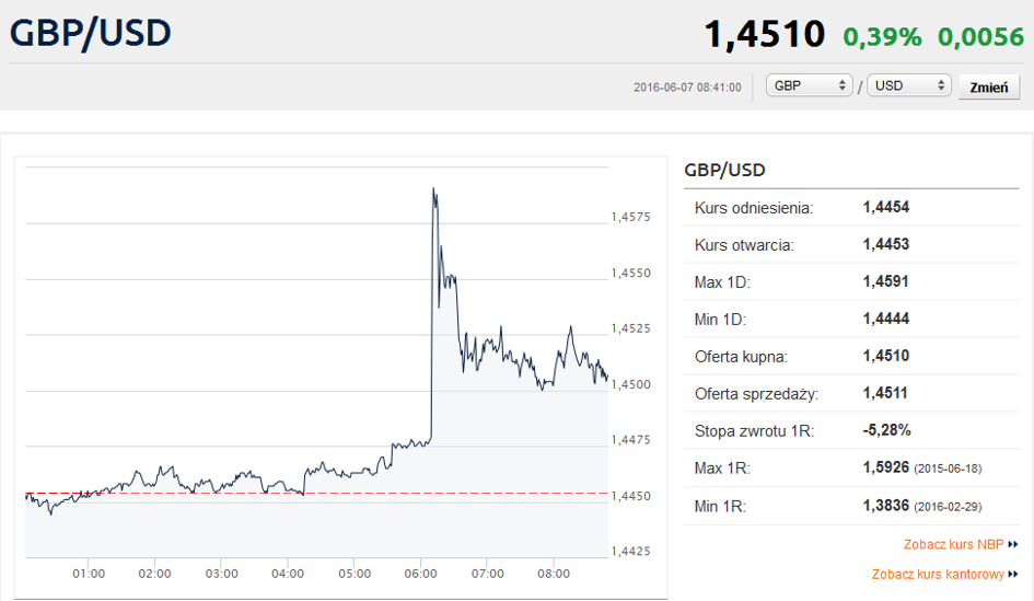 O godzinie 6:10 kurs GBP/USD w ciągu niespełna minuty podskoczył z 1,4478 do 1,4659 funta za dolara. Zmiana notowań dwóch z pięciu najważniejszych walut świata w ciągu mniej niż 60 sekund to rzadko obserwowane zjawisko nawet na bardzo zmiennym i nieprzewidywalnym Foreksie.