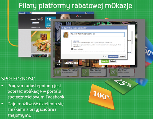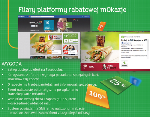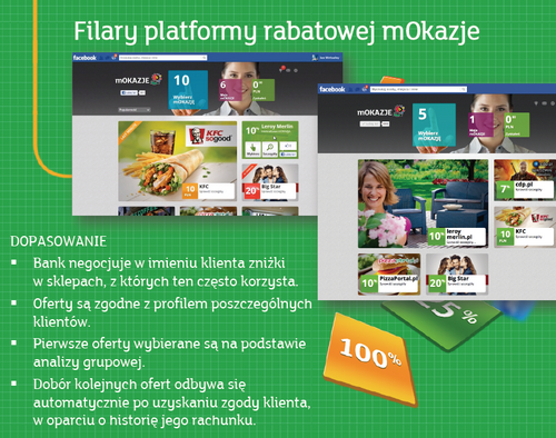 Na pierwszy ogień idzie jednak program rabatowy mOkazje. Na początek (czyli już od dziś) mOkazje będą dostępne na Facebooku, później dostępne będą w systemie transakcyjnym. Dziś wystarczy się zarejestrować w programie i przejść do aplikacji. Aplikacja facebookowa w żaden sposób nie pobiera danych z banku. Na tę chwilę dostępnych jest 5 ofert rabatowych. I trzeba przyznać, że jak na początek - przynajmniej te zaproponowane mi - są nawet niezłe. Na przykład rabat 10 zł w KFC przy zakupach na 20 zł, 5 zł przy zakupach za 10 zł w Starbucksie, czy 10 proc. rabatu na zakupy w internetowym sklepie leroymerlin.pl. Na prezentacji widoczne były też inne, na przykład 7 proc. na zakupy w internetowym sklepie CD-Projekt (wydawca Wiedźmina), czy 20 proc. w Big Starze.