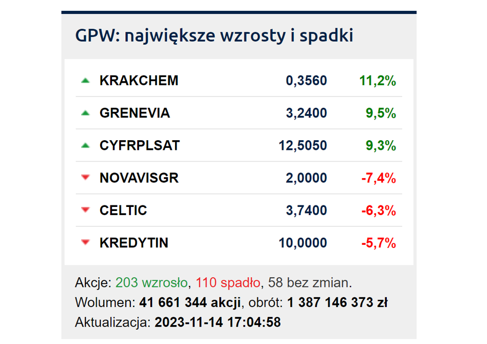 Wyróżniły pod względem skali wzrostów notowania Cyfrowego Polsatu (9,31 proc.), które odbiły z okolic historycznych minimów. Także kurs LPP zaliczył solidny wzrost o 7,72 proc. i JSW (6,59 proc.). Dalej za wspomnianymi bankami były m.in. akcje CD Projektu (5 proc.), które zyskiwały, nie zważając na ogłoszoną w poniedziałek sprzedaż pewnego pakietu akcji przez jednego z założycieli. W kontekście spadków na dolarze i zwyżkach cen surowców zyskiwał mocniej także KGHM (5,94 proc.). Najmniejszą skalą wzrostów wyróżniły się natomiast Kęty (1,56 proc.) i Dino (1,89 proc.).