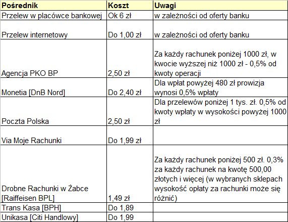 Jeśli klient nie korzysta z bankowości elektronicznej, to teoretycznie najtańszym sposobem będzie wizyta w kasie usługodawcy, gdzie nie jest pobierana żadna prowizja. Jest to jednocześnie najmniej wygodny sposób, ponieważ dysponując plikiem rachunków trzeba odwiedzić co najmniej kilka punktów w mieście. A to pociąga za sobą dodatkowo koszty transportu.