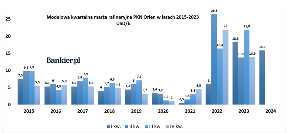 Orlen od czerwca 2023 r. nie publikuje wartości modelowej marży petrochemicznej ze względu na aktualizację formuły. Dużo niższe, w porównaniu z poprzednimi okresami były ceny gazu ziemnego, co oznacza niższe koszty zużycia na własne potrzeby, ale też gorsze wyniki w segmencie wydobywczym. Na TGE ceny spadła o 27 proc. kdk do 142 PLN/MWh, a na TTF o 36,7 proc. kdk do 119 PLN/MWh.