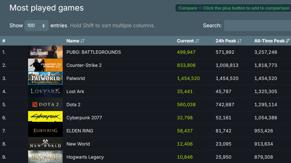 Według danych Steam, w grę jednocześnie grało 1,454 mln graczy, co uczyniło ją trzecią najlepszą pod tym względem w historii statystyk platformy. „Palworld” prześcignął tym samym „Cyberpunka 2077”, który na liczniku jednocześnie grających w swojej historii miał nieco ponad 1,05 mln graczy. Najnowszy hit Steam został także drugim najchętniej granym płatnym tytułem w historii platformy, zaraz za „PUBG Battlegrounds”, zanim ten przeszedł na model free-to-play.
