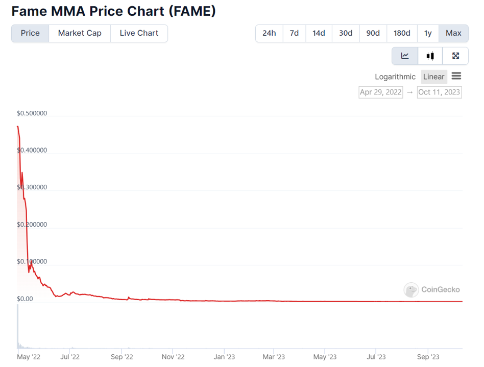 W tym miejscu warto przypomnieć, że ostatnia z wymienionych wydała swoje własne tokeny. Federacja freak fightów kreśliła przed fanami ambitne plany ich wykorzystania. Miały być używane do płatności w "ekosystemie Fame MMA" oraz w grze typu play-to-earn. Premiera tokenów miała miejsce w kwietniu 2022 roku, czyli tuż przed początkiem kryptowalutowej bessy. Obecnie ich kurs znajduje się 99,9% poniżej ceny sprzedaży, a ich temat ucichł.