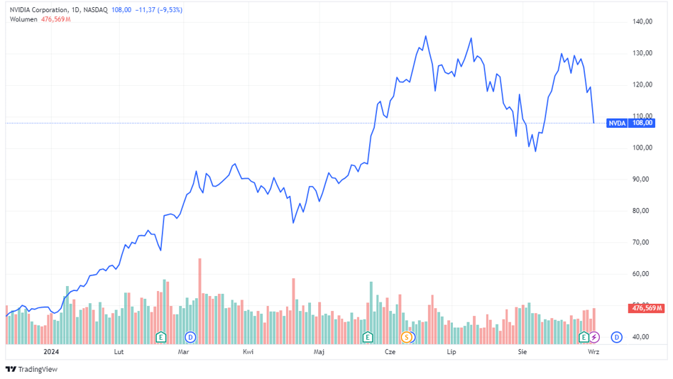 Pomimo głębokiej wtorkowej przeceny kurs akcji Nvidii znajduje się nadal 118 proc. wyżej niż na samym początku 2024 roku. Tydzień temu spółka przedstawiła swoje wyniki za drugi kwartał. Pomimo pobicia rynkowego konsensusu rynek przyjął je bez entuzjazmu.