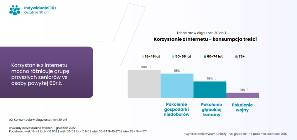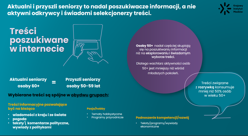 Internauci wieku 50+ nadal częściej skupiają się na poszukiwaniu informacji niż na eksplorowaniu i świadomym wyborze treści. Dlatego, w ocenie autorów raportu z badania, wachlarz aktywności osób 50+ jest mniejszy niż wśród młodszych pokoleń.
