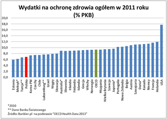 Na tym tle Polska prezentuje się całkiem nieźle - w 2011 roku na ochronę zdrowia przeznaczyliśmy o 2,3 proc. środków więcej niż rok wcześniej, co stanowiło 6,9 proc. PKB. Mimo to wciąż pozostajemy daleko za światową czołówką - Amerykanie wydają kwotę równą 17,7% PKB. Wśród nacji europejskich liderem są Holendrzy (11,9 proc.), Francuzi (11,6 proc.) i Niemcy (11,3 proc.).