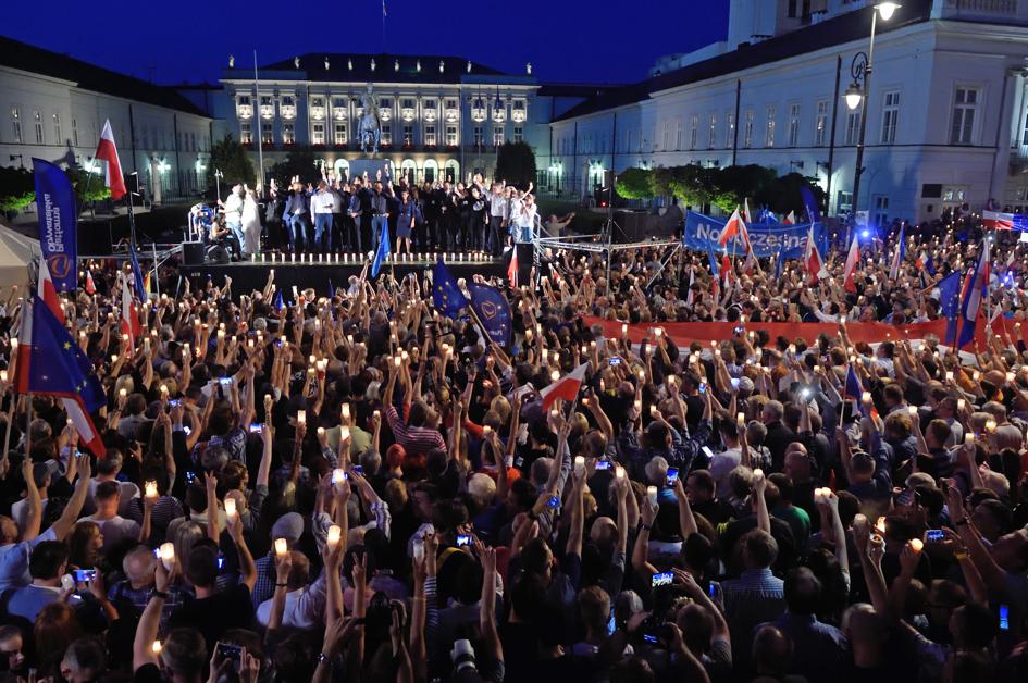Środowiska opozycyjne, w tym PO, Nowoczesna, PSL protestowały w czwartek ws. uchwalenia przez Sejm ustawy o SN. Protest przed Pałacem Prezydenckim po godz. 20 rozpoczęło odśpiewanie hymnu Polski i odczytanie przez aktorkę Joannę Szczepkowską preambuły do Konstytucji z 1997 r. Po demonstracji przed Pałacem Prezydenckim manifestanci przeszli pod Sejm.