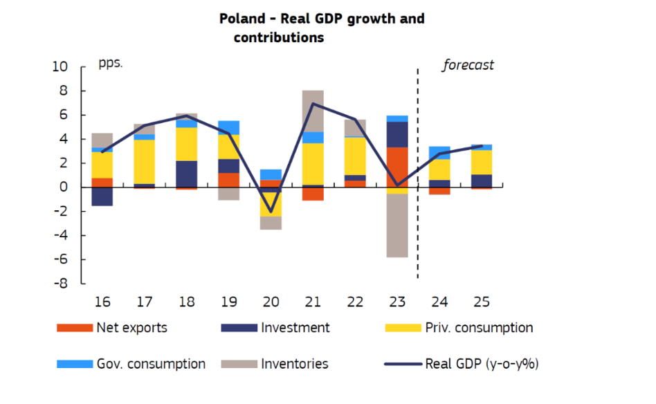 Komisja Europejska prognozuje, że w 2024 r. wzrost realnego PKB Polski odbije do 2,8%. Głównym czynnikiem wzrostu będzie konsumpcja prywatna, czemu będą sprzyjać szybko rosnące płace, dodatkowe wsparcie społeczne ze strony rządu zwiększające dochody do dyspozycji, poprawa nastrojów konsumentów i wygasająca presja inflacyjna.