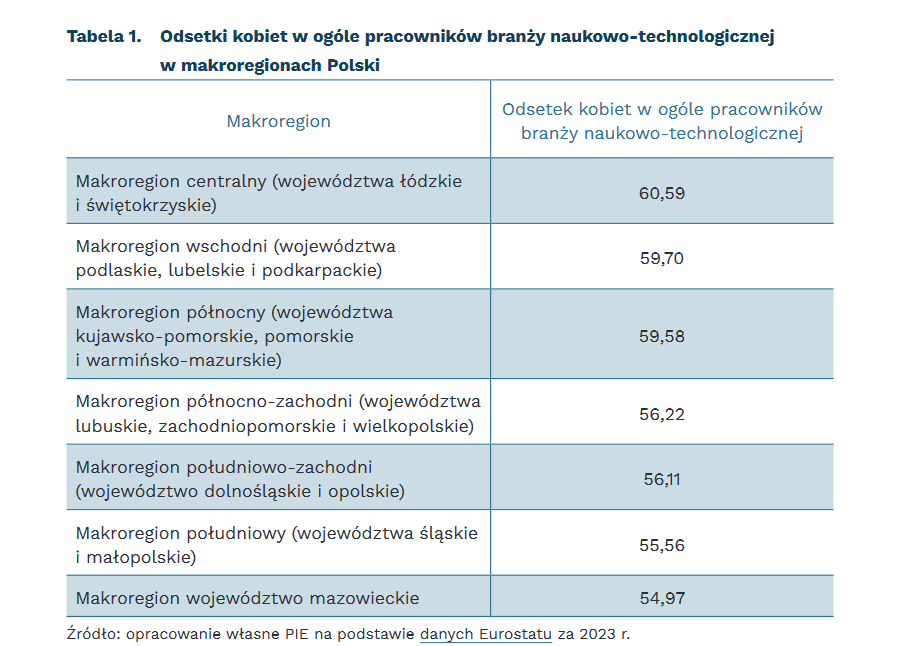 "Według danych Eurostatu, które podawane są dla tzw. makroregionów UE, Polska jest jednym z państw o najwyższym odsetku kobiet w branży naukowo-technologicznej" - podał PIE. Dodał jednocześnie, że w trzech polskich makroregionach odsetek kobiet w sektorze przekroczył 58 proc. Chodzi o makroregiony: centralny (województwa łódzkie i świętokrzyskie), gdzie było to 60,59 proc.; wschodni (województwa podlaskie, lubelskie i podkarpackie) - 59,70 proc. oraz północny (województwa kujawsko-pomorskie, pomorskie i warmińsko-mazurskie) - 59,58 proc.