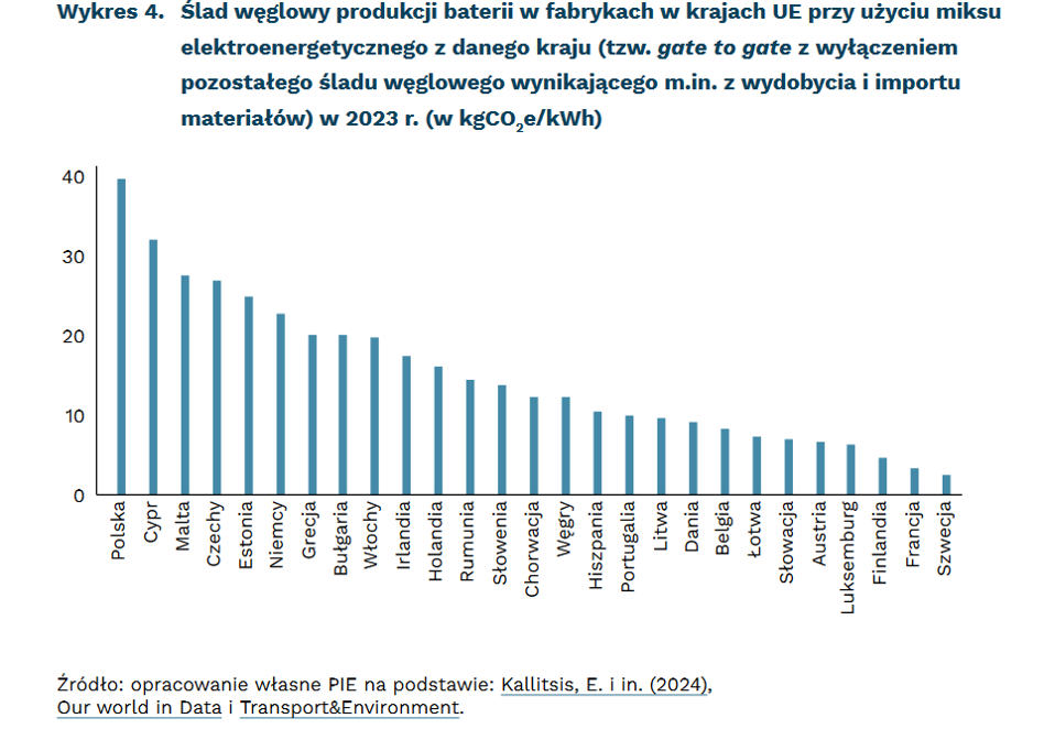 "To oznacza, że średni ślad węglowy procesu produkcji na 1 kWh baterii wynosiłby u nas blisko 40 kg, podczas gdy we Francji – jedynie 3,5 kg. Dodając to do 45-60 kg śladu węglowego, jaki występuje we wszystkich wcześniejszych etapach produkcji, możemy przełożyć na 30-50 proc. różnicy śladu węglowego między takimi samymi bateriami wyprodukowanymi w tych dwóch krajach. To może sprawiać, że baterie wyprodukowane w Polsce nie będą mieścić się w górnej granicy śladu węglowego ustalonego w kolejnych aktach wykonawczych" - dodali.