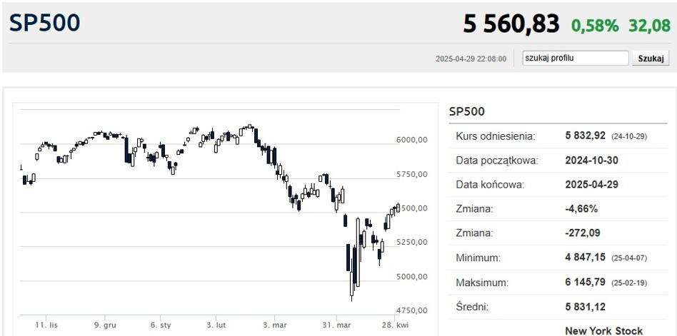 Pierwsze 100 dni rządów Trumpa upłynęło pod znakiem giełdowej huśtawki. Indeks S&P 500 osiągnął rekordowy poziom w lutym, po czym w marcu obniżył notowania. Jednak potężna przecena przyszła na początku kwietnia, gdy prezydent USA ogłosił "Dzień Wyzwolenia" i cła na niemal wszystkie kraje świata. Dołek notowań został osiągnięty 8 kwietnia, kiedy to SP 500 był na progu wejścia na rynek niedźwiedzia. Sytuację odmienił jednak jeden tweet i późniejsze wystąpienie Trumpa.