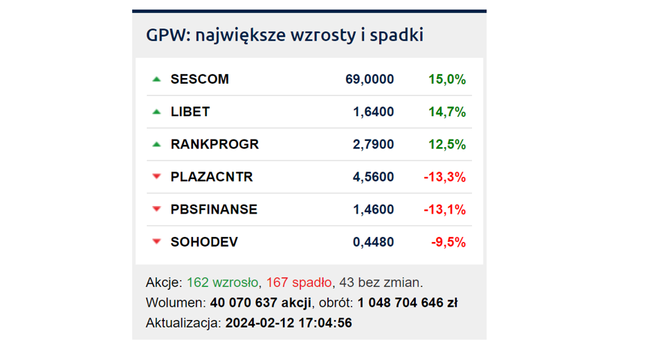WIG20 zyskał 1,55 proc., WIG był wyżej o 1,24 proc. Z kolei mWIG40 wzrósł o 0,69 proc., a sWIG80 spadł o 0,12 proc. Obroty wyniosły 1,05 mld zł, z czego 830 mln dotyczyło WIG.