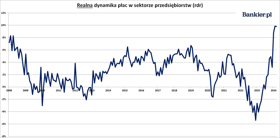 Wciąż bardzo wysoki, dwucyfrowy wzrost płac to jedno, ale prawdziwym ekonomicznym hitem jest niemal rekordowo szybki przyrost wynagrodzeń w ujęciu realnym. Według danych GUS w marcu inflacja CPI obniżyła się do 2,0%. Oznacza to, że realny wzrost „średniej krajowej” w marcu 2024 roku wyniósł aż 9,80% w skali roku. To rezultat tylko nieznacznie niższy od absolutnie rekordowych 9,85% odnotowanych w lutym. Malejąca inflacja i wyższa dynamika płac nominalnych oznacza, że w ujęciu realnym płace rosną najszybciej od przynajmniej 25 lat, od kiedy to dysponujemy porównywalnymi danymi.