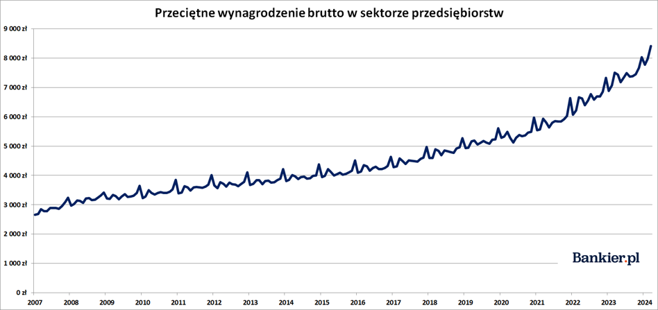 Przeciętne wynagrodzenie brutto w dużych firmach niefinansowych w marcu 2024 roku wyniosło 8408,79 zł brutto i było nominalnie (tzn. bez uwzględnienia inflacji) o 12,0% wyższe niż przed rokiem – poinformował Główny Urząd Statystyczny. W ujęciu nominalnym jest to nowy rekord, o 375 zł przebijający poprzednie maksimum z grudnia ubiegłego roku.