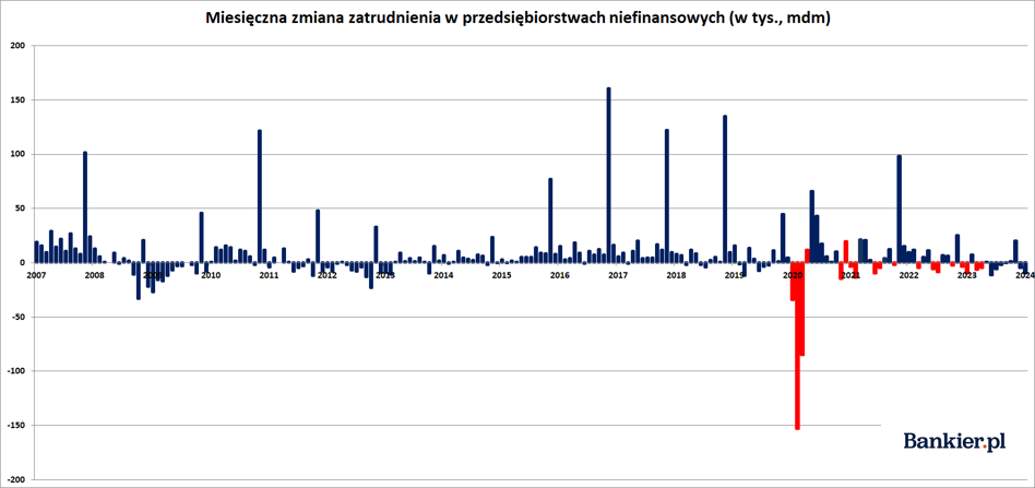 Nominalne wynagrodzenie w sektorze przedsiębiorstw osiągnęło nowy rekord wszech czasów, realnie rosnąc w niemal rekordowym tempie. Towarzyszył temu jednak coraz głębszy spadek zatrudnienia.