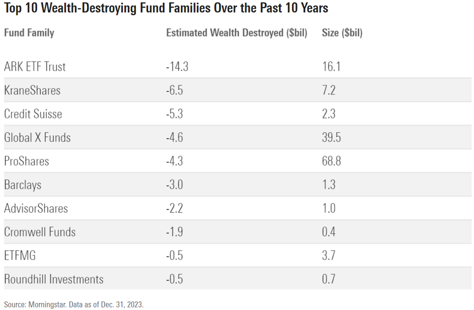 Rodzina funduszy od ARK ETF Trust otrzymała zaszczytne pierwsze miejsce w rankingu dostawców ETF-ów, które najmocniej spustoszyły portfele inwestorów w ciągu 10 lat do końca 2023 roku. Według analizy Morningstar majątek inwestorów, którzy kupili giełdowe fundusze Cathie Wood, skurczył się w tym czasie o 14,1 mld dolarów.