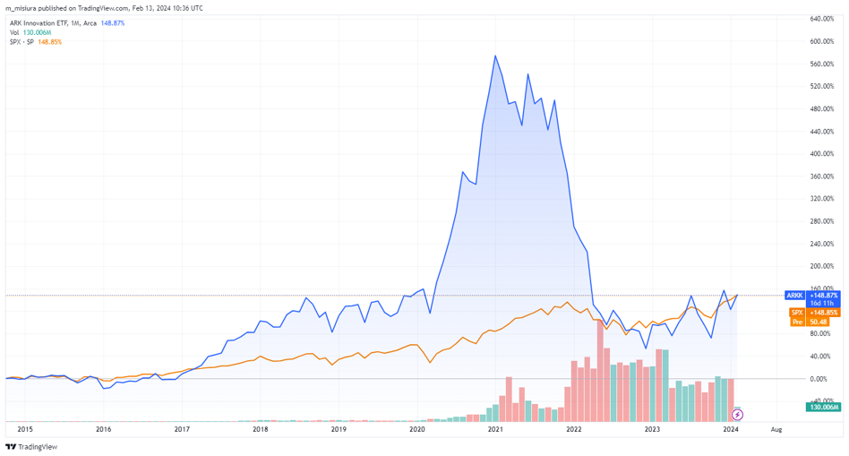 W latach 2017-2020 flagowy fundusz Cathie Wood, czyli ARK Innovation ETF (ARKK), osiągnął annualizowany zwrot rzędu 61%, przyćmiewając indeks S&P500, który przyniósł w tamtym czasie 16%.
