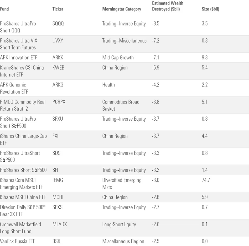 Przed ARKK znalazł się jeszcze ProShares Ultra VIX Short-Term Futures ETF, który wyssał z kieszeni inwestorów 7,2 mld dolarów. Za funduszem Cathie Wood, na czwartym miejscu, znalazł się KraneShares CSI China, który jak sama nazwa wskazuje, dał stracić na chińskich spółkach i to całe 5,3 mld dol.