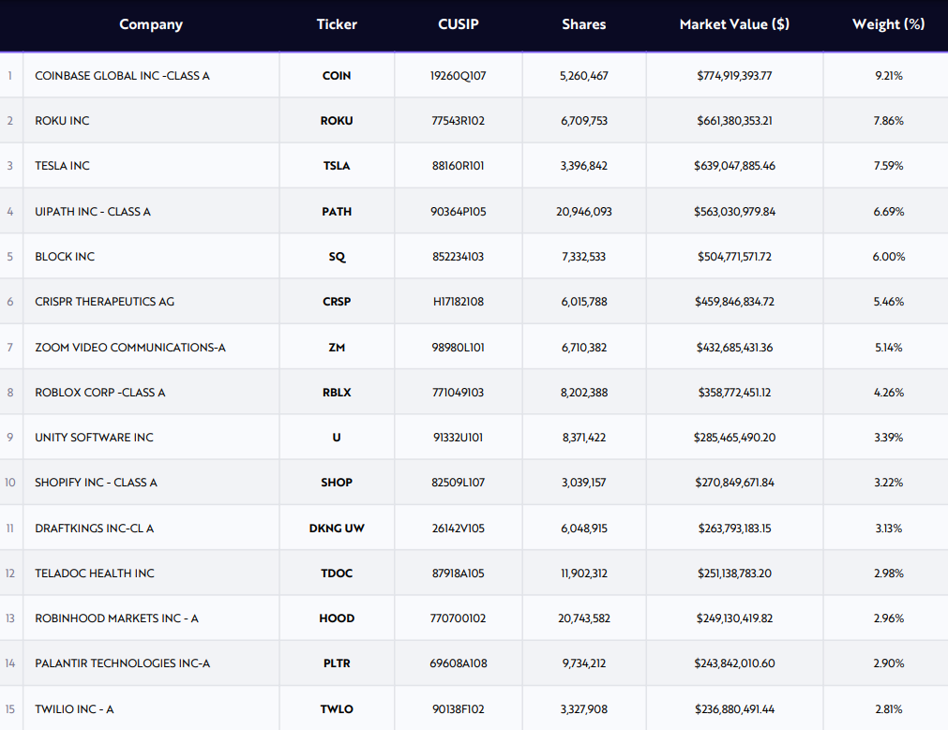 Największy udział w portfelu ARKK, czyli aż 9,21%, stanowią akcje amerykańskiej giełdy kryptowalut Coinbase kupowane po praktycznie każdej cenie. W ostatnich dniach notowania spółki zyskują mocno dzięki rosnącemu rynkowi kryptowalut. W ciągu ostatniego tygodnia umocniły się o prawie 25%. Patrząc na historyczną korelację pomiędzy Coinbase i bitcoinem, dobra passa prawdopodobnie utrzyma się, jeśli BTC będzie wciąż piął się do góry.