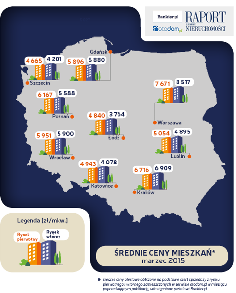 Bez względu na to, jaki rynek mieszkań zostanie wzięty pod uwagę – pierwotny czy wtórny – koszty zakupu w marcu względem poprzednich miesięcy nie zaskakują. Najdroższe mieszkania w Warszawie utrzymują średnie ceny ofertowe na poziomie 7600 zł/mkw. na rynku pierwotnym i 8500 zł/mkw. na rynku wtórnym. Wśród miast objętych badaniem najtańsze mieszkania od dewelopera są natomiast w Szczecinie (4665 zł/mkw.), a z drugiej ręki najniższe ceny oferują sprzedawcy z Łodzi (3764 zł/mkw.) – wynika z raportu Bankier.pl sporządzonego na podstawie danych serwisu otoDom.pl.