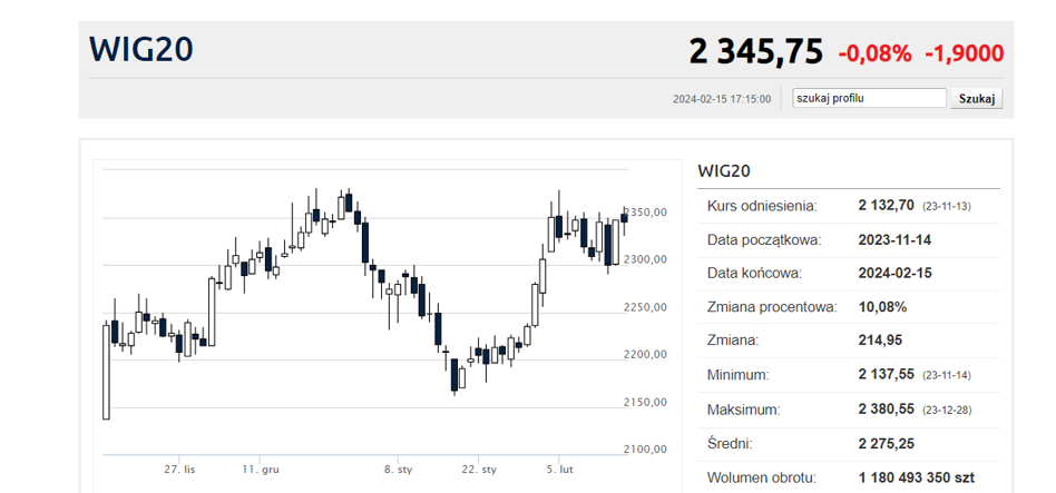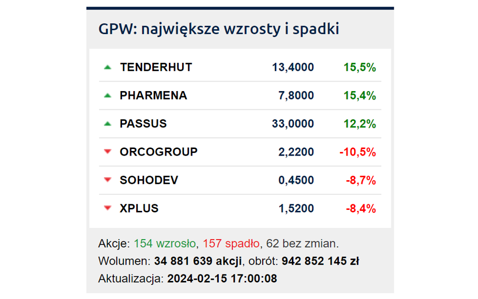 Najmniej oddał kurs Orange (-0,09 proc.). Spółka przedstawiła wyniki za IV kwartał 2023 r., prognozy na ten rok oraz zadeklarowała dywidendę w wysokości 0,48 zł na akcje.