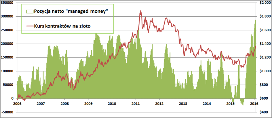 A jeszcze pod koniec grudnia pozycja netto funduszy w kontraktach na złoto była ujemna! Oznacza to, że ta grupa per saldo grała na dalsze spadki cen złota, które wówczas osiągnęły 5-letnie minimum. Nie jest przypadkiem, że złoto prawdopodobnie wyznaczyło dołek bessy, gdy większość dużych spekulantów miało pozycję krótką.