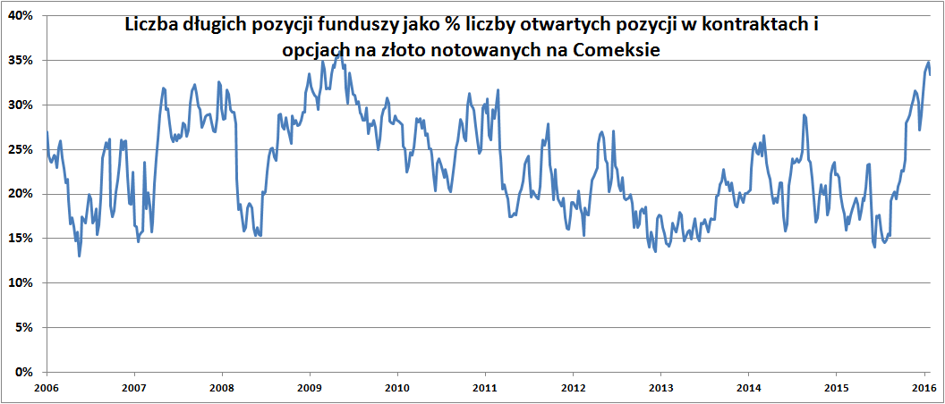 Jednak nawet gdyby odnieść wielkość zaangażowania spekulantów do liczby otwartych pozycji, to rynek wydaje się „przegrzewać”. Przez ostatnią dekadę udział liczby długich pozycji funduszy w LoP wahał się od 15% do 35%. Dotychczasowy rekord to 36% z października 2010 roku. Miesiąc później na rynku złota pojawiła się korekta, ale po niej ceny rosły aż do przełomu sierpnia i września 2011 r. Sama końcówka tamtej hossy odbywała się już bez udziału tzw. smart money.